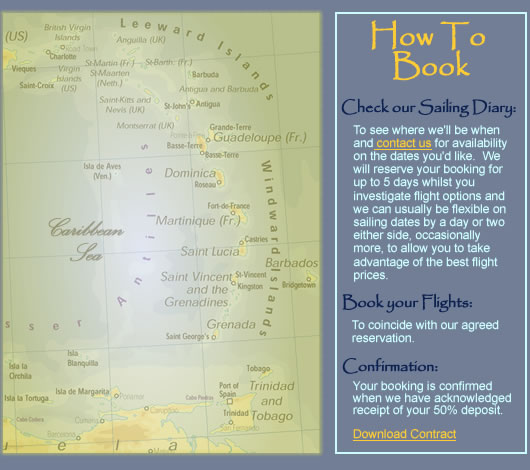 The Caribbean comes alive between mid November and the end of May when there are steady sailing winds and it is safe for IBIS to travel to any of the islands. The regatta circuit is in full swing, Carnivale is pumping and the tourist influx makes for a lively time ashore. Flights, of course, tend to be a little more expensive and availability often limited so it's worth booking well ahead, expecially for the peak times at Christmas, New Year and Easter. |