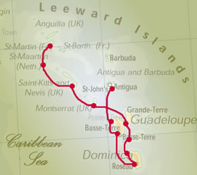 Adventure Sailing in the Leeward IslandsAnother of our popular sailing odysseys where you get to explore some of the secret Caribbean whilst improving your skills and confidence on board! Make no mistake, this is full on sailing with a packed itinerary and loads to see and do! If you need to build some miles towards your sailing certificates or you just fancy an adventure, what better way than with some sunny blue water cruising from Antigua to Guadeloupe and Dominica, and then back up to St Martin via Monserrat or St Kitts? You'll also have the chance to practice and hone your skippering and passage planning skills along the way. Our 14 day itinerary will need to take into account the long range forecasts, and with a prevailing Easterly we should be on a fast beam reach much of the time. IBIS absolutely loves this kind of sailing and gives fast, comfortable passages between the islands. With plenty of stops en route to sample the local food and atmosphere this is a real blue water adventure trip to beat all others! If you want an idea of what this trip's about, see our Ship's Log of the journey going South and vice versa , and take a look at the video on our homepage. Want to follow it up with an Ocean passage ? Why not combine your stay with the start of our Atlantic Adventure from St Martin to Bermuda via the BVI's? or arrive a few days earlier and have extra time enjoying quiet anchorages of Antigua.